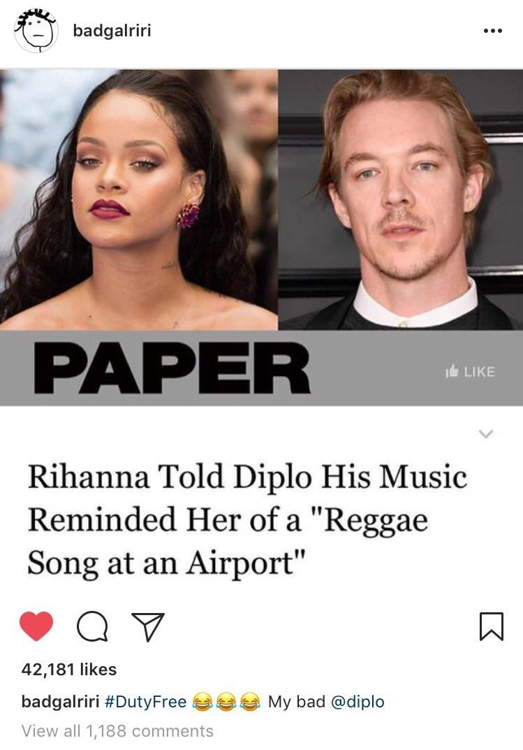 随后Rihanna在ins上发了一张自己说Diplo的音乐让她想起“机场上放的雷鬼音乐”的新闻截图。