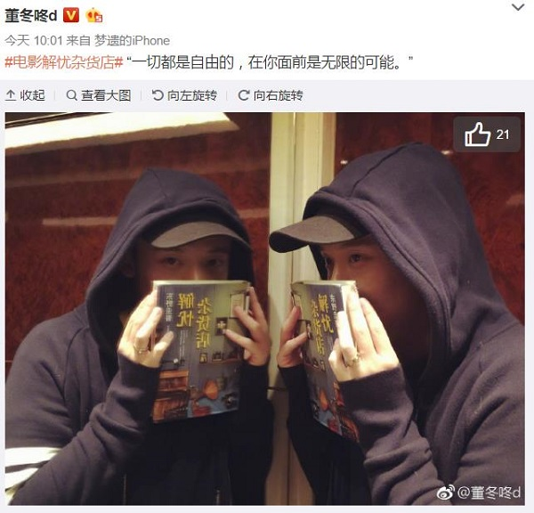 22日,中国版《解忧杂货铺》电影公布演员阵容,王俊凯、迪丽热巴、董子健将担任电影中最为核心的三个角色,随后主创人员纷纷在微博上公布了这一消息。