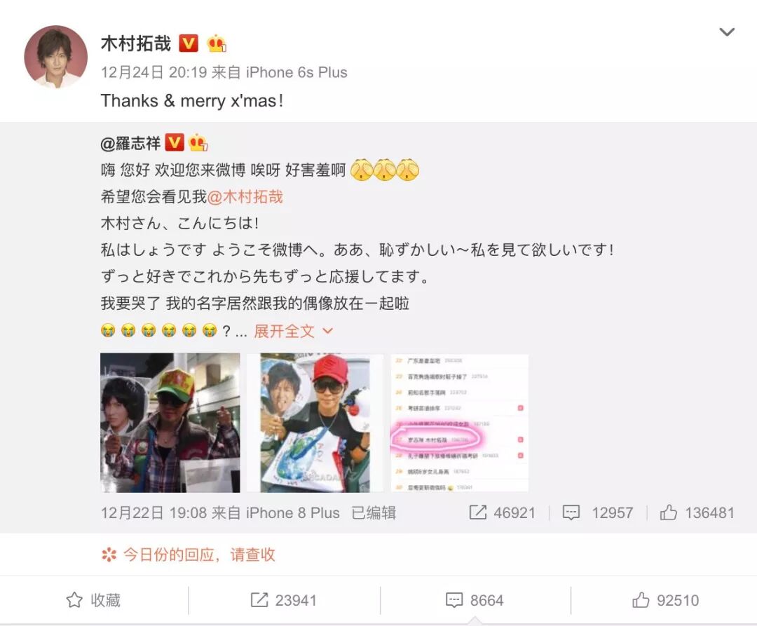 罗志祥更是在木村拓哉开通微博后,天天跑到他微博下面打卡,向全世界宣告自己对木村的喜爱。