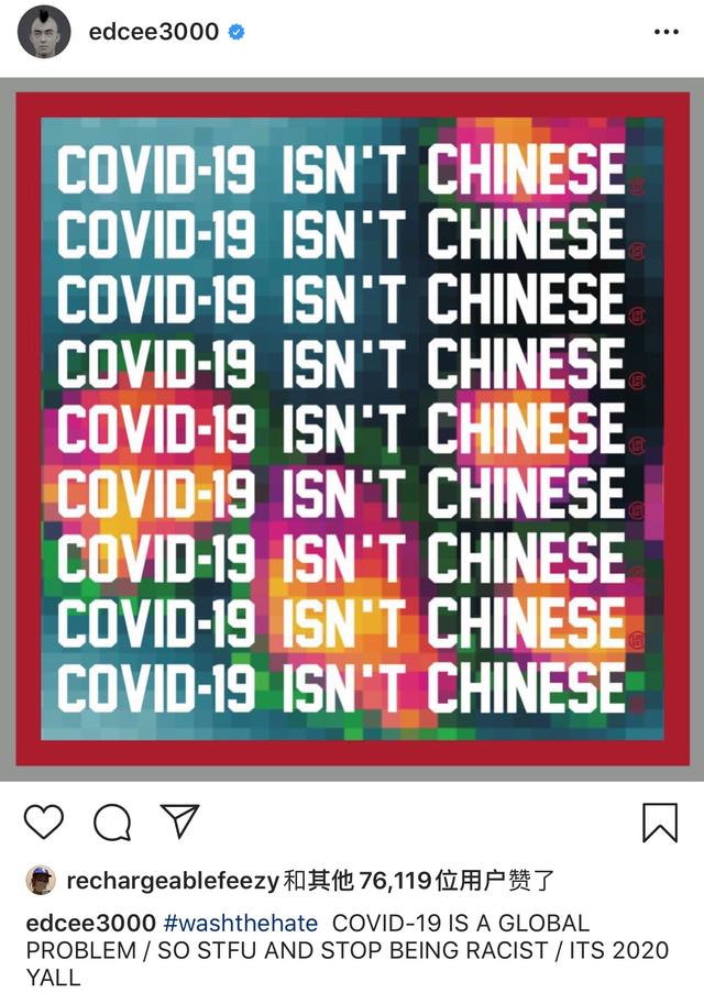 “COVID-19不是中国病毒,所以都TMD给我闭嘴。停止种族歧视,现在已经2020年了。”