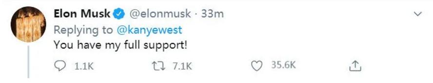 随后他的老婆金·卡戴珊转发了此条推特支持老公事业,特斯拉创始人马斯克也表示了全力支持。