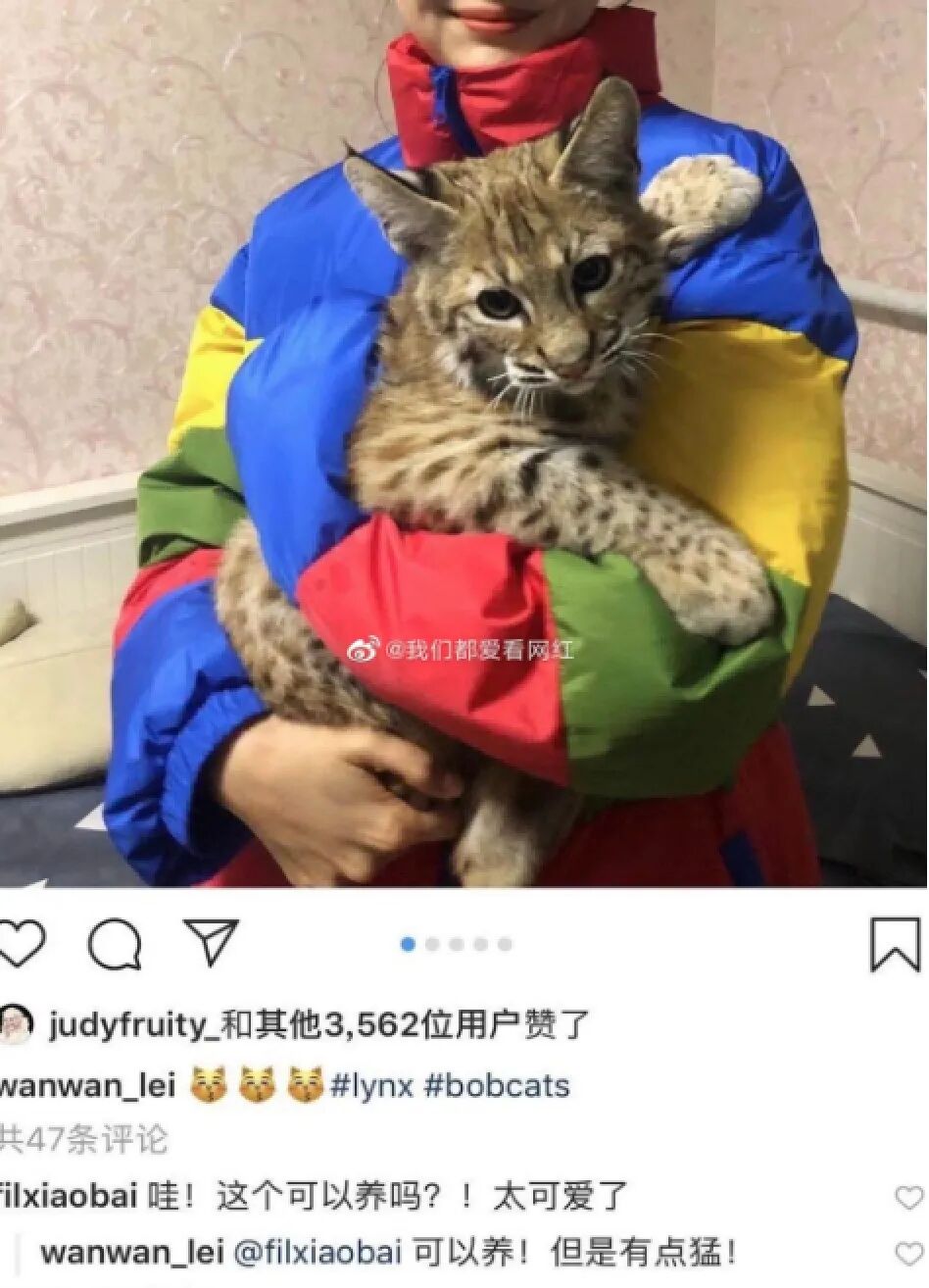 晒与猞猁的合照,被网友指出这是国家二级保护动物,仍表示可以家养。